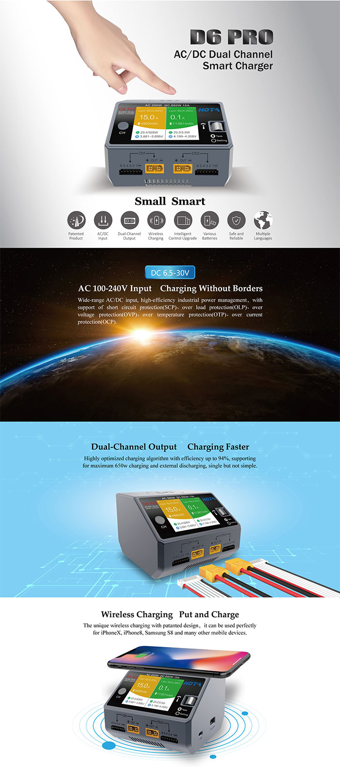 HOTA D6 Pro AC200W DC650W 15A デュアルポートスマートバッテリー充電器 1-6S LipoNiMHバッテリー