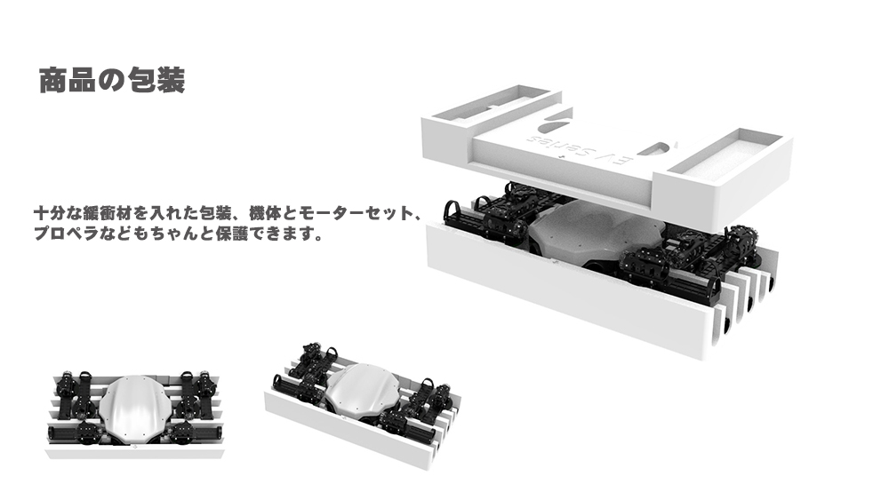 十分な緩衝材を入れた包装、機体とモーターセット、プロペラなどもちゃんと保護できます。