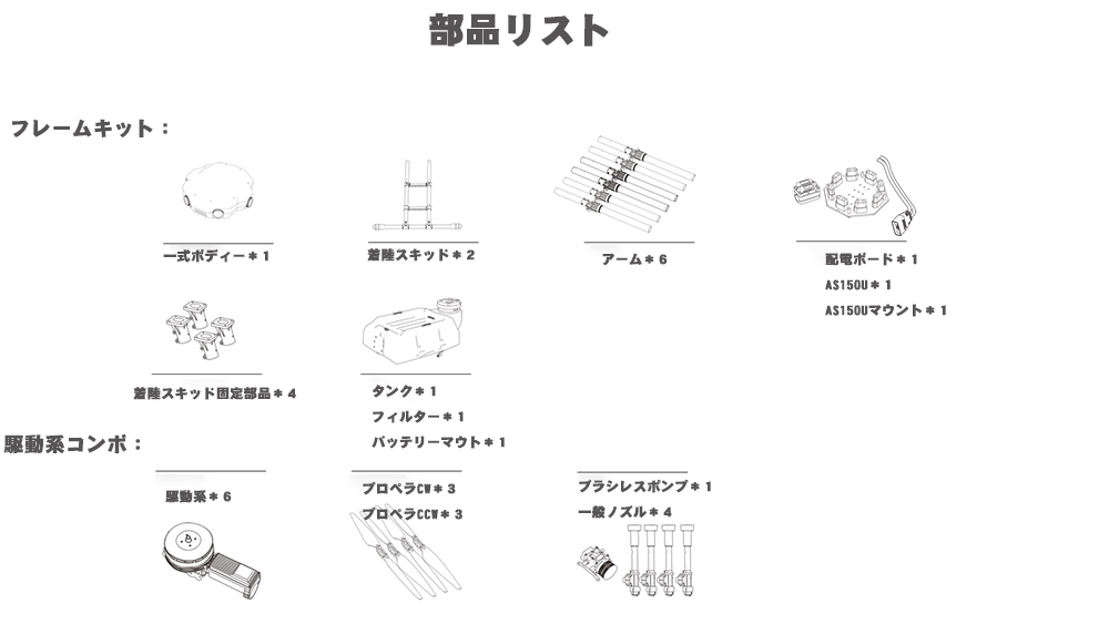 一式のボディー*1 着陸スキッド*2 アーム*4 配電盤*1 AS150U *1 コネクターマウント*1 着陸スキッドの固定部品*4 タンク*1(フィルター、バッテリーマウント付属) |