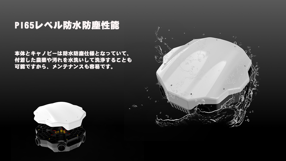 本体とキャノピーは防水防塵仕様となっていて、付着した農薬や汚れを水洗いして洗浄することも可能ですから、メンテナンスも容易です。