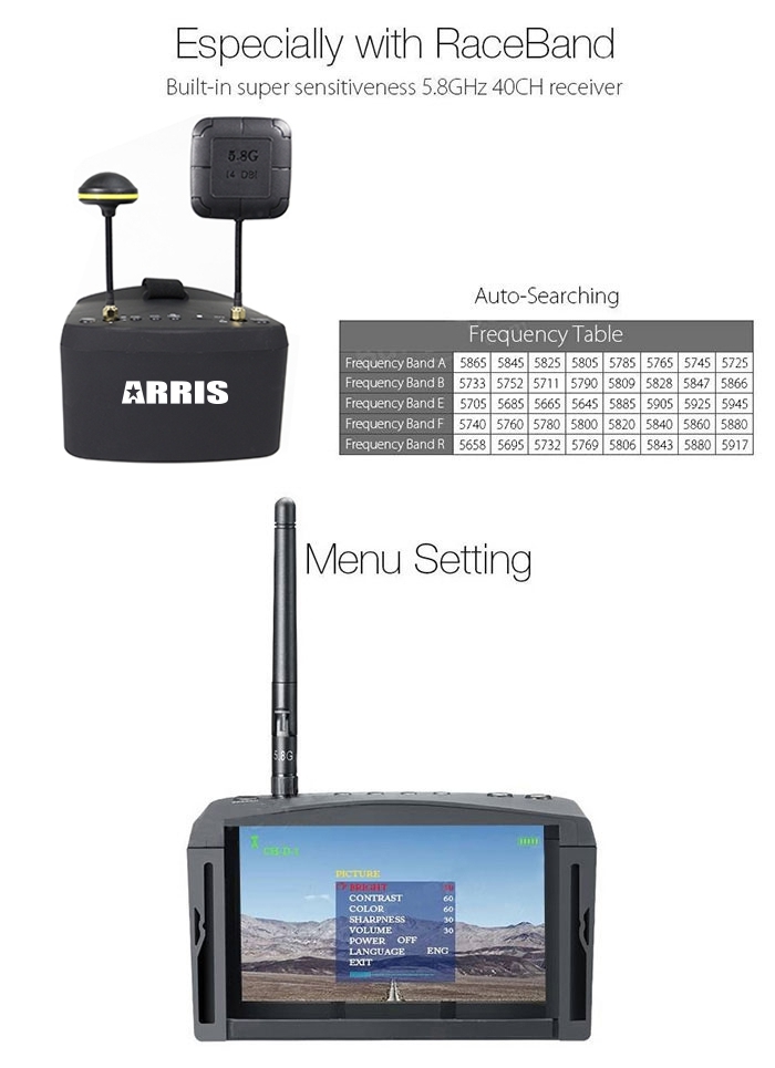 ARRIS EV800D5インチ5.8gHD DVR 800 x 480 FPVゴーグル(レシーバー内蔵、バッテリー付き)は、FPVとして初心者達お勧めします。