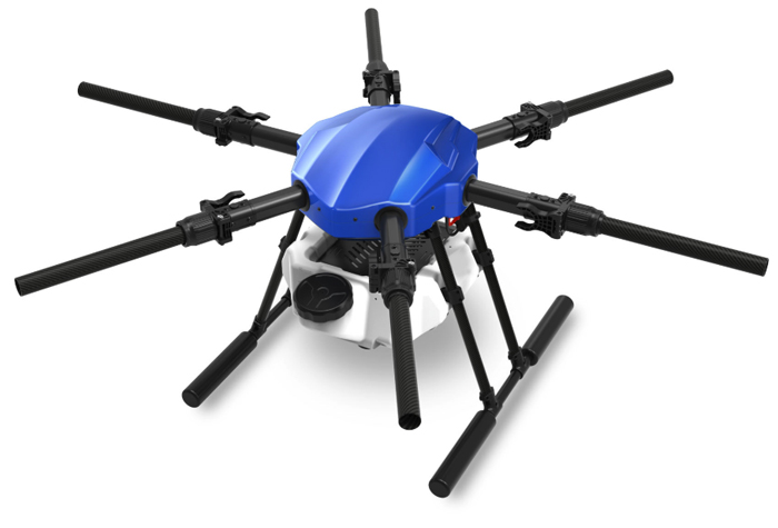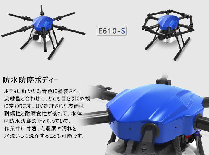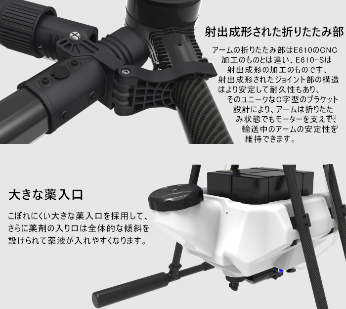 E610-SはE610のアップバーションとして発表しております。液体の農薬、肥料および除草剤の様々な散布をおこなうために設計されたヘキサコプターです。アームの折りたたみ部はE610のCNC加工のものとは違い、E610-Sは射出成形の加工のものです、射出成形されたジョイント部の構造はより安定して耐久性もあり、そのユニークなC字型のブラケット設計により、アームは折りたたみ状態でもモーターを支えて、輸送中のアームの安定性を維持できます。