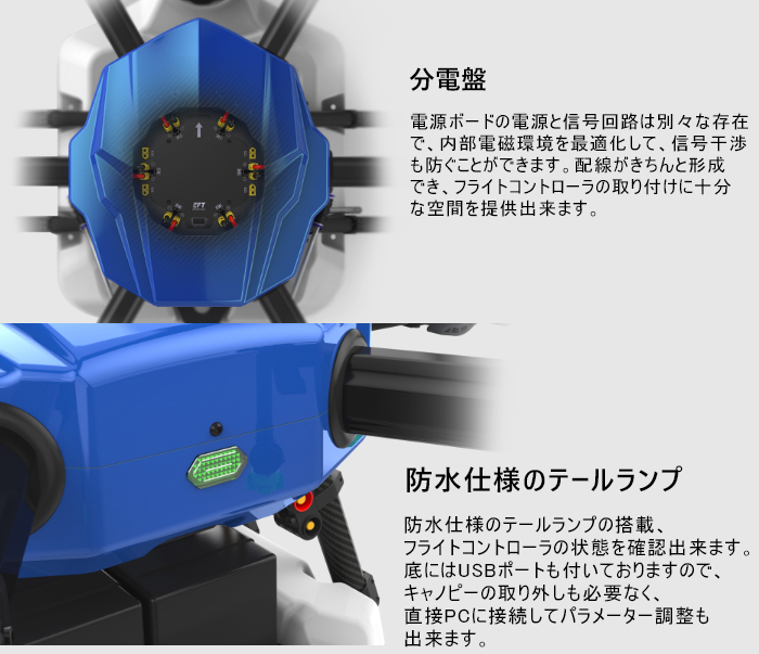 防水仕様のテールランプの搭載、フライトコントローラの状態を確認出来ます。