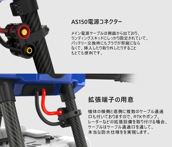 機体の横側と底側に複数のケーブル通過口も付いておりますので、RTKやポンプ、レーダーなどの拡張設備を取り付ける場合、ケーブルはケーブル通過口を通して、本当な防水仕様をを実現します。