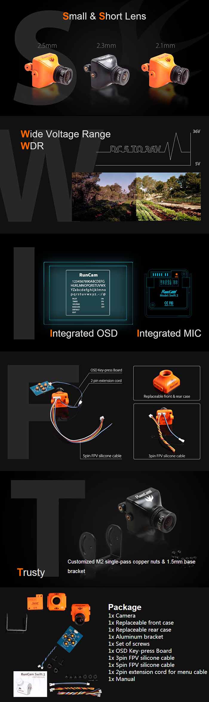 RunCam Swift 2 ミニカメラはFPVレースドローンに適用する最新fpvカメラです。主な特徴の一つは統合されたOSD二より、カメラの入力電圧と電池電圧をを表示できることです。