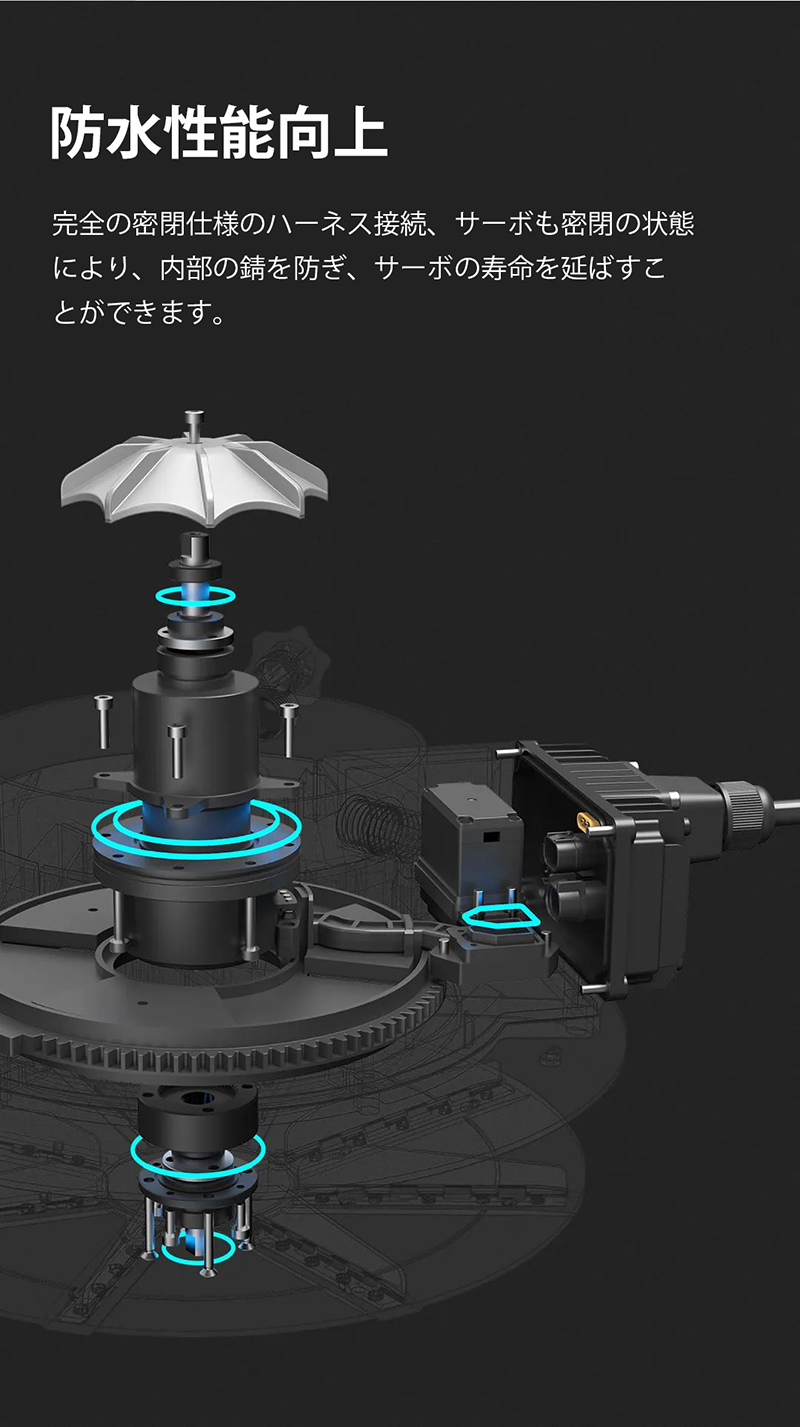 完全の密閉仕様のハーネス接続、サーボも密閉の状態により、内部の錆を防ぎ、サーボの寿命を延ばすことができます。