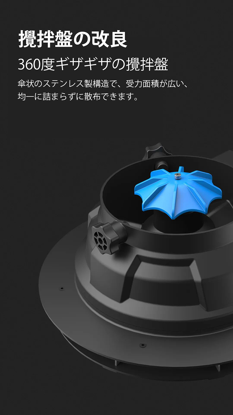 傘状のステンレス製構造で、受力面積が広い、均一に詰まらずに散布できます。