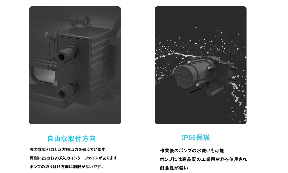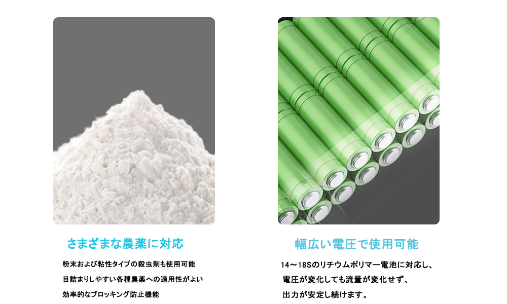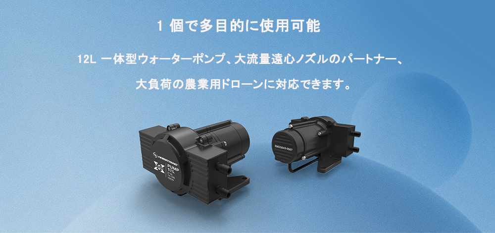 大流量遠心スプリンクラーと組み合わせて、大負荷の農業ドローン用に活用できます。最大流量 12L/min(2×6L)、最小流量 0.6L/min (2*0.3)です。