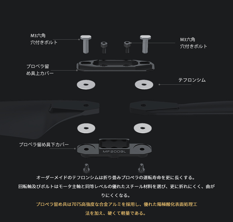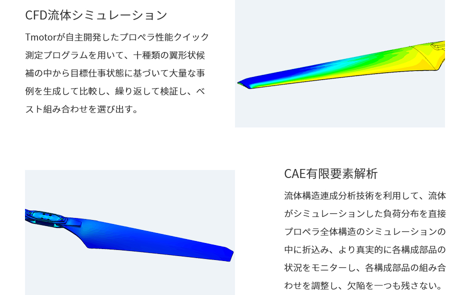 プロペラの制作は、射出技術の限界に挑戦しており、プロペラの後縁端の厚さは0.25mmの、気流干渉は少なく、 揚力比も増加します。