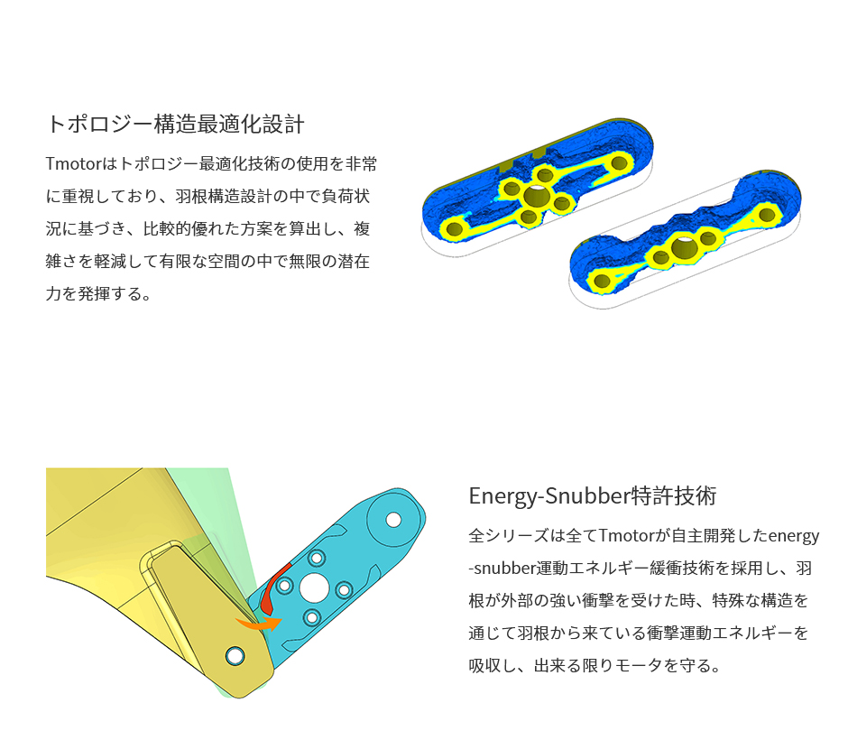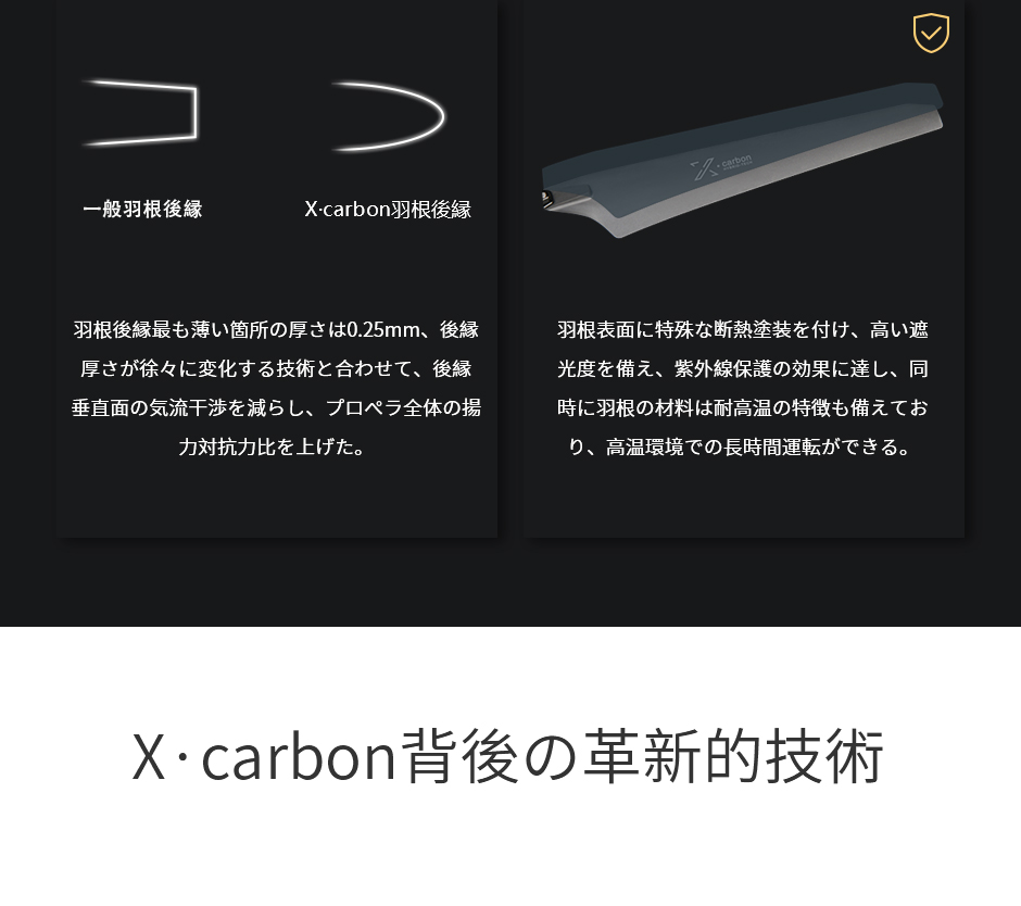 赤外線の影響からプロペラを保護することを目的とする断熱塗料を表面に使用します、また、耐熱性のある材質により、高温の環境でも長時間を飛行することができます。