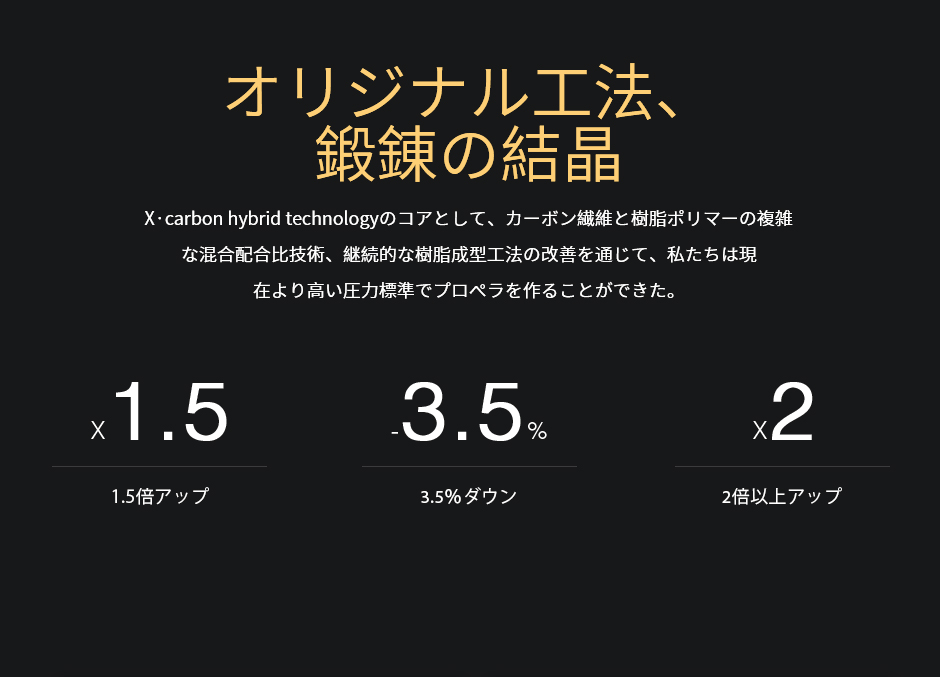 当社独自のカーボン・ファイバーとポリマーの混合技術により、また射出成形プロセスを組み合わせることで、最適な材質のプロペラを制作できます。