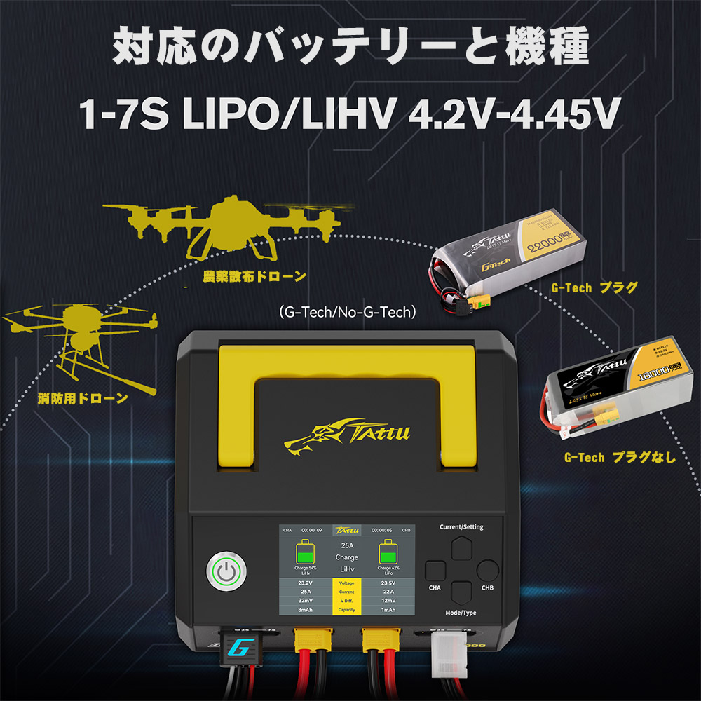対応のバッテリーの種類とセル数:LiPo/LiHV 1-7s (G-Tech プラグサポート可能)