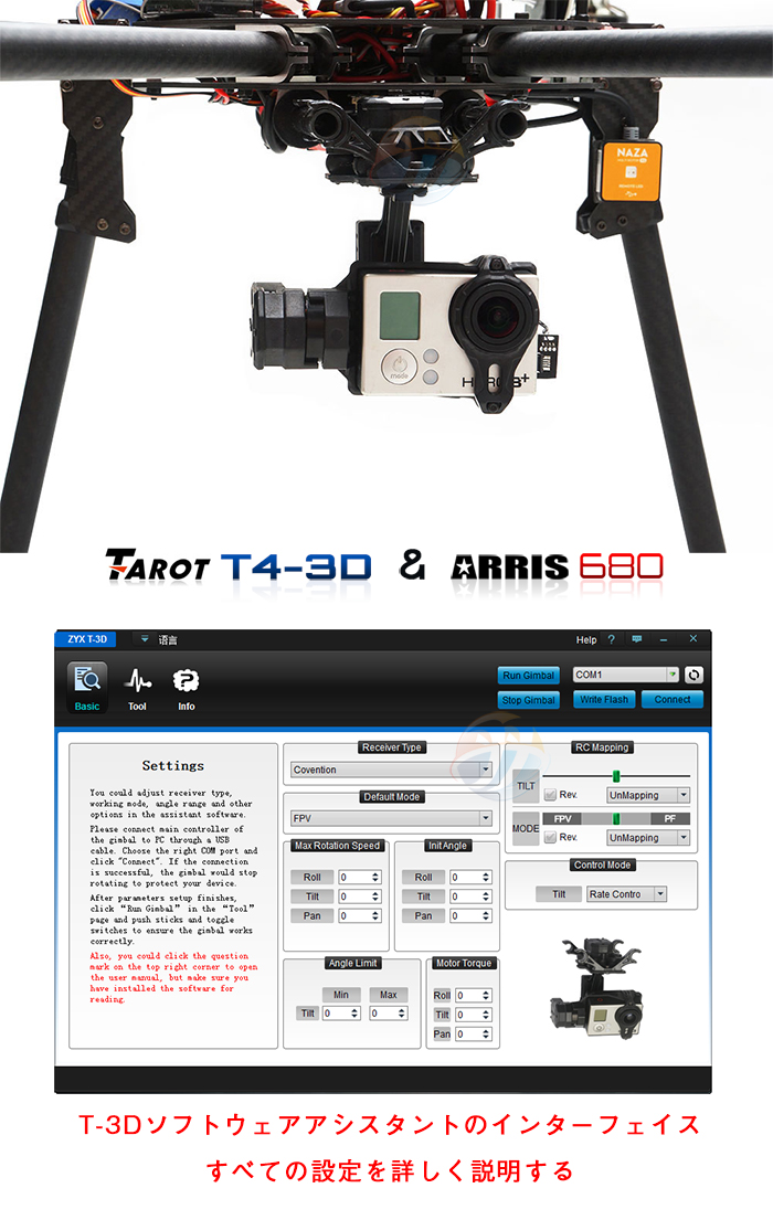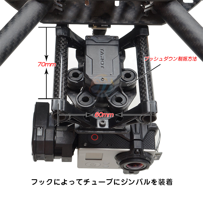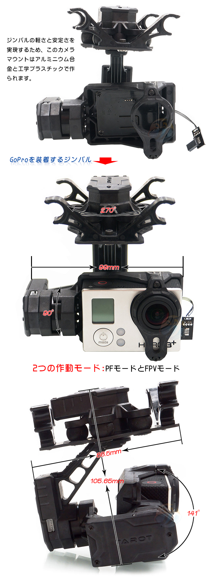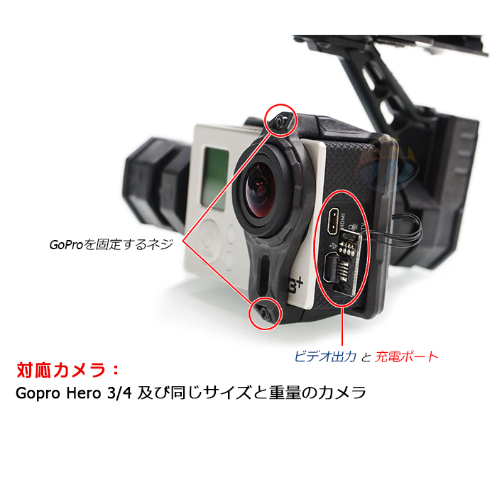 GoPro HERO3/ HERO4 (またはこれらと同じサイズ/重量のカメラ)用の高性能3軸ジンバル、機体への取り付けも簡単、マルチコプター、固定翼機やヘリコプターでも使用可能です。