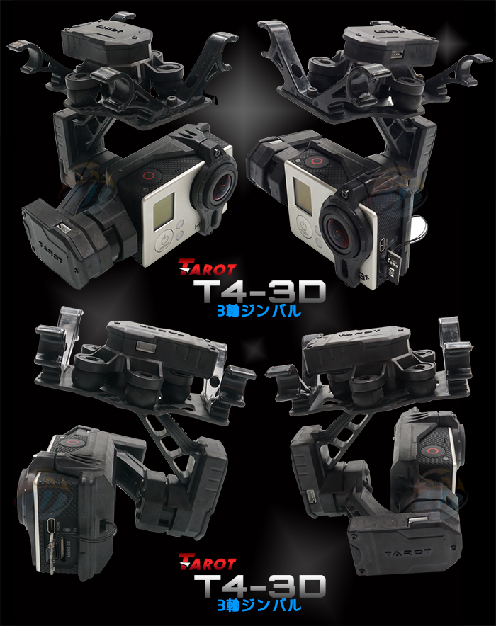 Tarot T4-3D 3軸安定化ジンバルはGoPro HERO3/ HERO4(およびサイズと重量もこれらと同じの他のカメラ)用に設計された製品です。アルミニウム合金や強化プラスチックから統合されたボディ、軽量で安定性も高いです。過酷な環境下でもカメラ姿勢を正確に制御し、よりスムーズな映像を撮影可能にします。