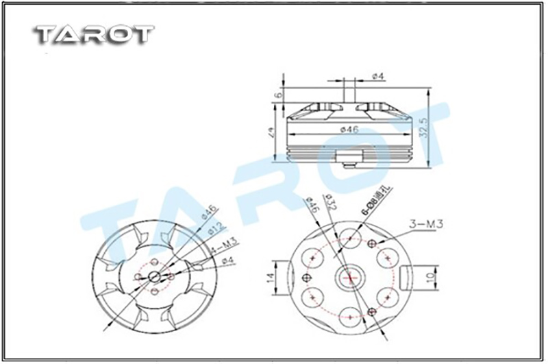 - プロペラ取り付け仕様:主穴径4mm、側穴径3mm、中心距離12mm