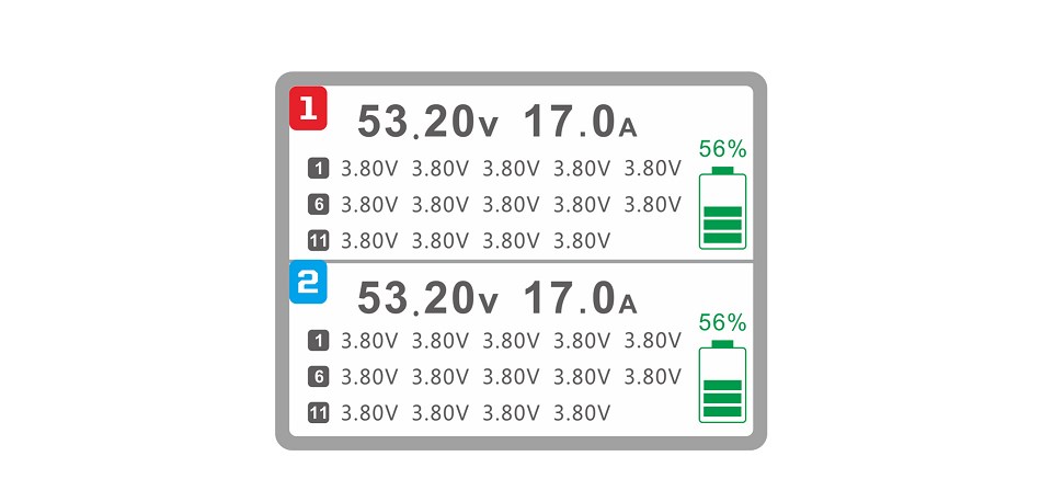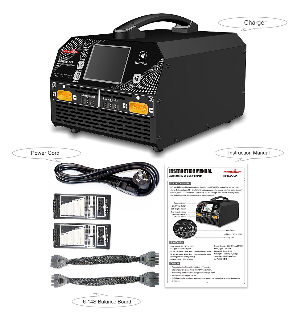 UP1800-14Sの最大バランス電流は1.5A/セルです。各セルのバッテリー電圧を監視し、バッテリーの寿命を延ばすためにバランス充電を維持するため、バッテリーセル電圧のバランスをとります。