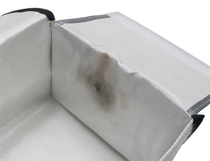 当社の耐火テストでも炎が上がることはありませんでした。アルミ蒸着部分が変色するだけです。非常に安全性の高いLi-Poバックであることが確認しました。