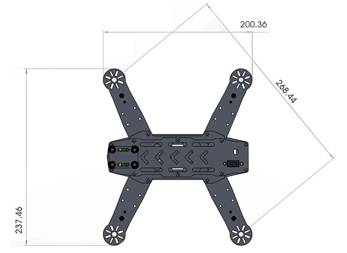 ARRIS X250B フレームの対角ホイールベースは約 268mm で、アッパー プレートとロワー プレートの間の内部空間はかなり大きく、6 インチ プロペラを取り付けるなど、お客様の好みに応じてアップグレードまたは変更を加えることができます。
