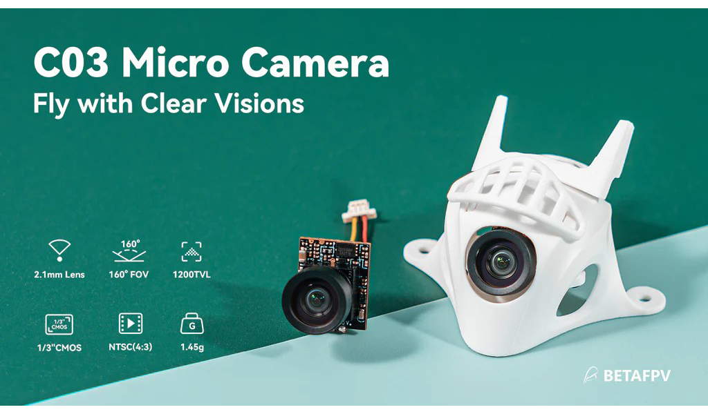C03 FPVマイクロカメラは1.45g超軽量で、屋内用マイクロFPVクアッドコプターのための素晴らしいカメラです。1/3インチCMOSセンサーによる1200TVLの高解像度、160°FOVの2.1mmレンズ、優れたレイテンシーが特徴で、ゴーグルを通して高品質でクリアかつシャープな画像を誇る。
