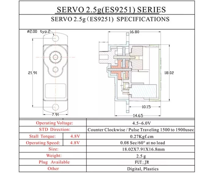 1 x EMAX ES9251 2.5g プラスチックマイクロデジタルサーボ