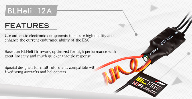 BLHeli12AはESCの電流の耐久能力を向上させ、また高品質を確保するために、本物の電子部品を使用しています。BLHeliのファームウェアに基づいて、偉大な直線性とはるかに速くスロットルレスポンスの高い性能のために最適化され、これは、特にマルチコプター用に設計されており、固定翼航空機やヘリコプターとの互換性もあります。