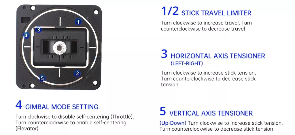 AG01と同じチップセットであるV4.0ホールジンバルを備えた標準バージョンは、最適化されたホールセンサー回路であり、中心点の位置決めと温度の安定性を向上させます。 スティックトラベル、セルフセンタリング、スティックテンションが外部から調整できるようになりました。