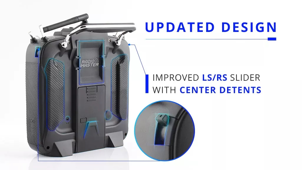リアグリップのレイズドバージョンとフラットバージョンの両方が含まれているため、TX16sMKIIの感触を箱から出してすぐにカスタマイズできます。